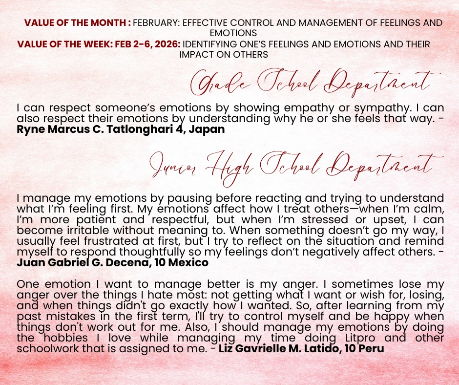 We are delighted to share the Kings Best Value Reflections from our exceptional students for the week of January 26-30 and February 2-6. During this time, students focused on the value of ๐ฃ๐ฟ๐ฎ๐ฐ๐๐ถ๐ฐ๐ถ๐ป๐ด/๐๐ถ๐๐ถ๐ป๐ด ๐ผ๐๐ ๐๐ต๐ฒ ๐ณ๐๐ฆ (๐๐ฟ๐ถ๐๐ฒ, ๐๐ถ๐ฟ๐ฒ๐ฐ๐๐ถ๐ผ๐ป, ๐๐ผ, ๐๐ถ๐๐ฐ๐ถ๐ฝ๐น๐ถ๐ป๐ฒ, ๐๐ฒ๐๐ฒ๐ฟ๐บ๐ถ๐ป๐ฎ๐๐ถ๐ผ๐ป, ๐๐ฎ๐ฟ๐ฒ, ๐ฎ๐ป๐ฑ ๐๐ถ๐๐ถ๐ป๐ถ๐๐) ๐ถ๐ป ๐๐ฐ๐ฐ๐ผ๐บ๐ฝ๐น๐ถ๐๐ต๐ถ๐ป๐ด ๐๐ผ๐ฎ๐น๐ and ๐๐ฑ๐ฒ๐ป๐๐ถ๐ณ๐๐ถ๐ป๐ด ๐ข๐ป๐ฒ’๐ ๐๐ฒ๐ฒ๐น๐ถ๐ป๐ด๐ ๐ฎ๐ป๐ฑ ๐๐บ๐ผ๐๐ถ๐ผ๐ป๐ ๐ฎ๐ป๐ฑ ๐๐ต๐ฒ๐ถ๐ฟ ๐๐บ๐ฝ๐ฎ๐ฐ๐ ๐ผ๐ป ๐ข๐๐ต๐ฒ๐ฟ๐.