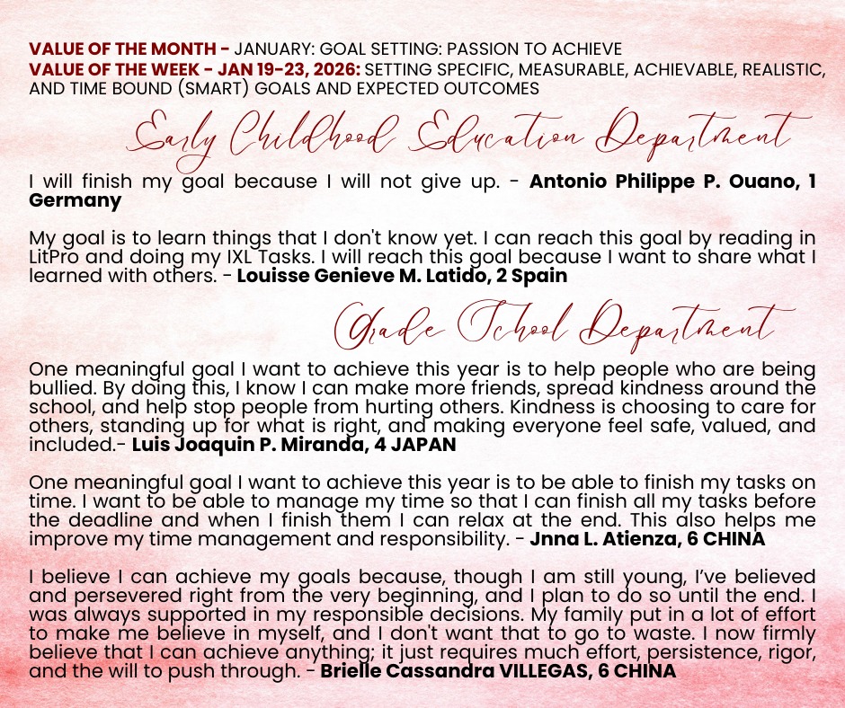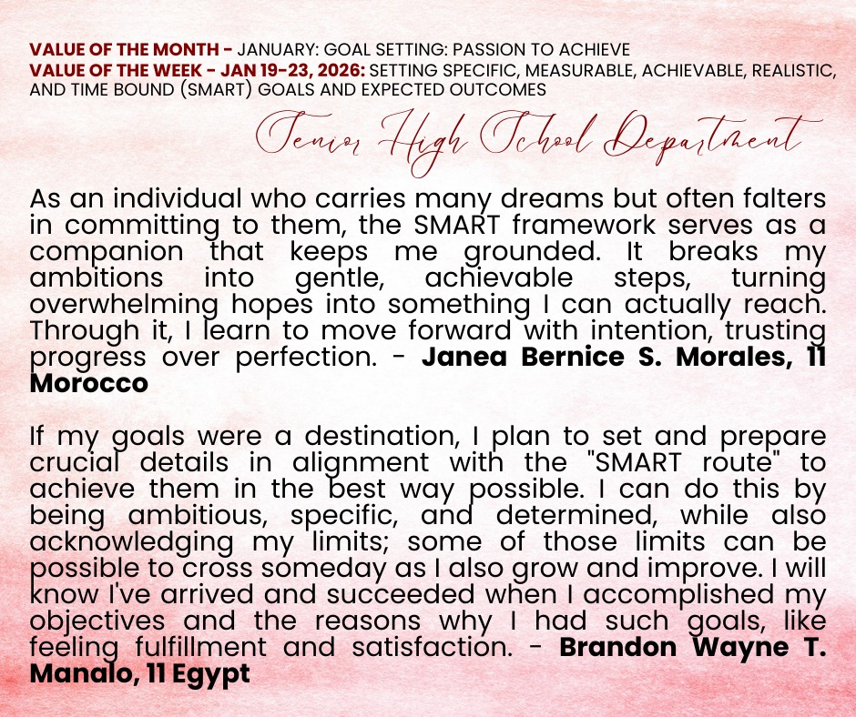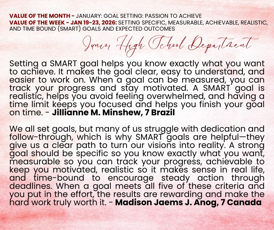 We are delighted to share the Kings Best Value Reflections from our exceptional students for the week of January 19 to 23. During this time, students focused on the value of “𝗦𝗲𝘁𝘁𝗶𝗻𝗴 𝗦𝗽𝗲𝗰𝗶𝗳𝗶𝗰, 𝗠𝗲𝗮𝘀𝘂𝗿𝗮𝗯𝗹𝗲, 𝗔𝗰𝗵𝗶𝗲𝘃𝗮𝗯𝗹𝗲, 𝗥𝗲𝗮𝗹𝗶𝘀𝘁𝗶𝗰, 𝗮𝗻𝗱 𝗧𝗶𝗺𝗲-𝗯𝗼𝘂𝗻𝗱 (𝗦𝗠𝗔𝗥𝗧) 𝗚𝗼𝗮𝗹𝘀 𝗮𝗻𝗱 𝗘𝘅𝗽𝗲𝗰𝘁𝗲𝗱 𝗢𝘂𝘁𝗰𝗼𝗺𝗲𝘀”