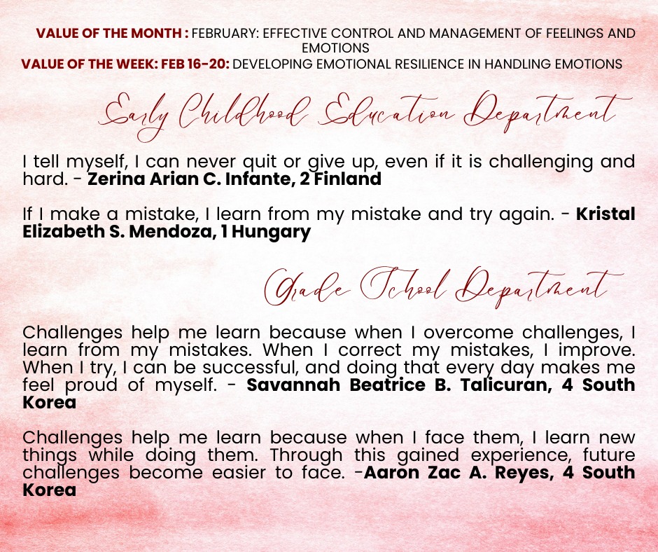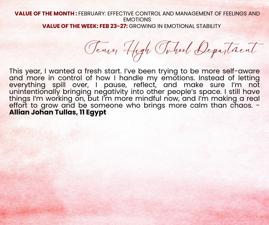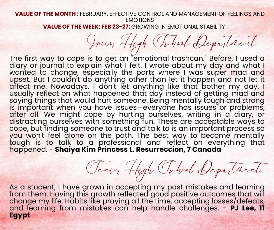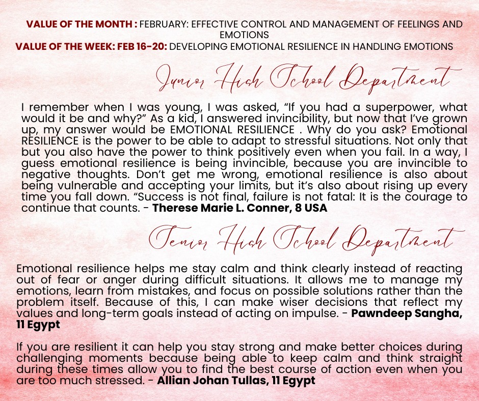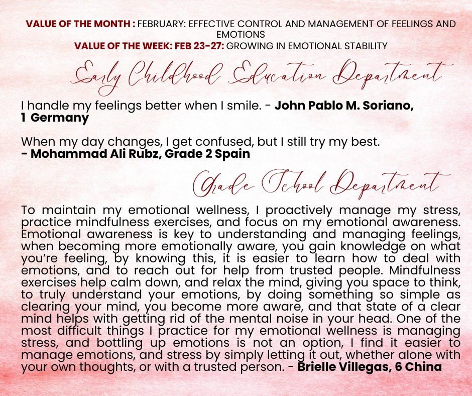Over the past few weeks, our students have taken part in meaningful activities that nurtured their ability to understand, manage, and express their emotions in healthy ways. As they navigated different experiences, learners strengthened their capacity to pause, process, and respond thoughtfully rather than react impulsively. They discovered that growing in emotional stability empowers them to build stronger relationships, make wiser decisions, and remain grounded even in moments of uncertainty.
