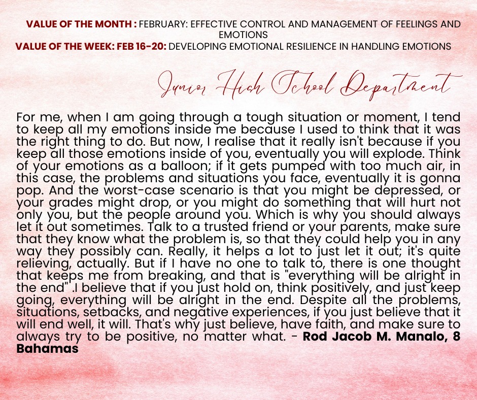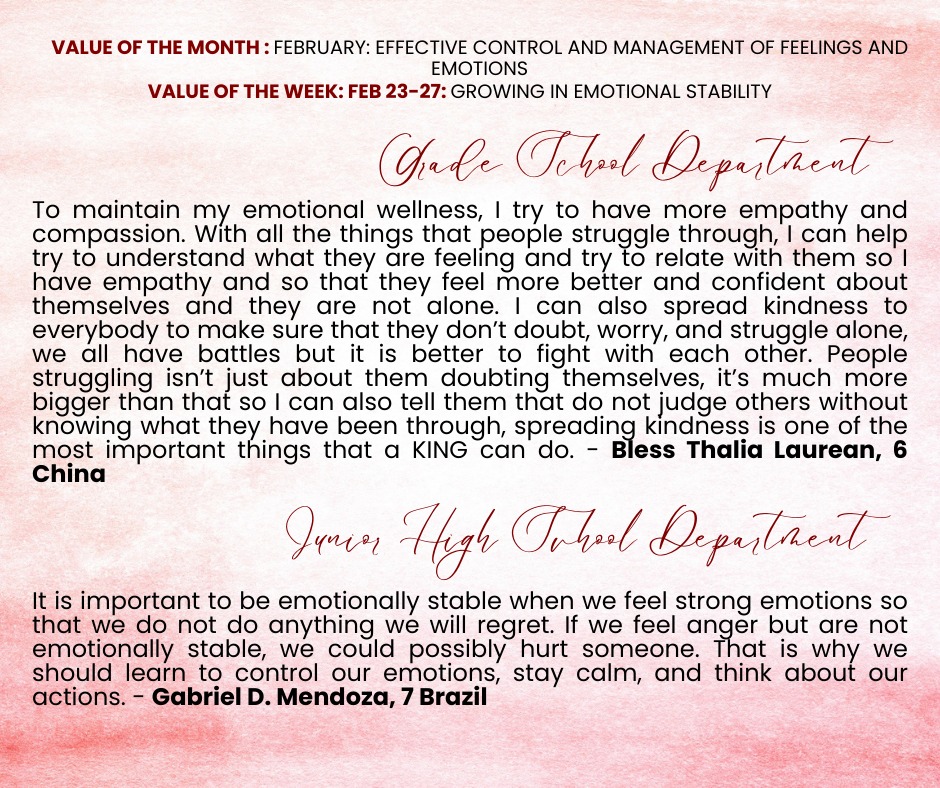 We are delighted to share the Kings Best Value Reflections from our exceptional students for the week of February 16-20 and February 23-27. During this time, students focused on the value of ๐๐ฒ๐๐ฒ๐น๐ผ๐ฝ๐ถ๐ป๐ด ๐๐บ๐ผ๐๐ถ๐ผ๐ป๐ฎ๐น ๐ฅ๐ฒ๐๐ถ๐น๐ถ๐ฒ๐ป๐ฐ๐ฒ ๐ถ๐ป ๐๐ฎ๐ป๐ฑ๐น๐ถ๐ป๐ด ๐๐บ๐ผ๐๐ถ๐ผ๐ป๐ and ๐๐ฟ๐ผ๐๐ถ๐ป๐ด ๐ถ๐ป ๐๐บ๐ผ๐๐ถ๐ผ๐ป๐ฎ๐น ๐ฆ๐๐ฎ๐ฏ๐ถ๐น๐ถ๐๐.