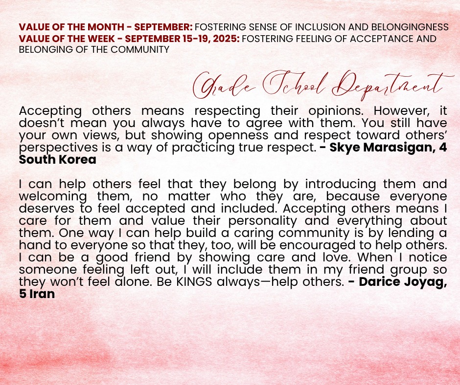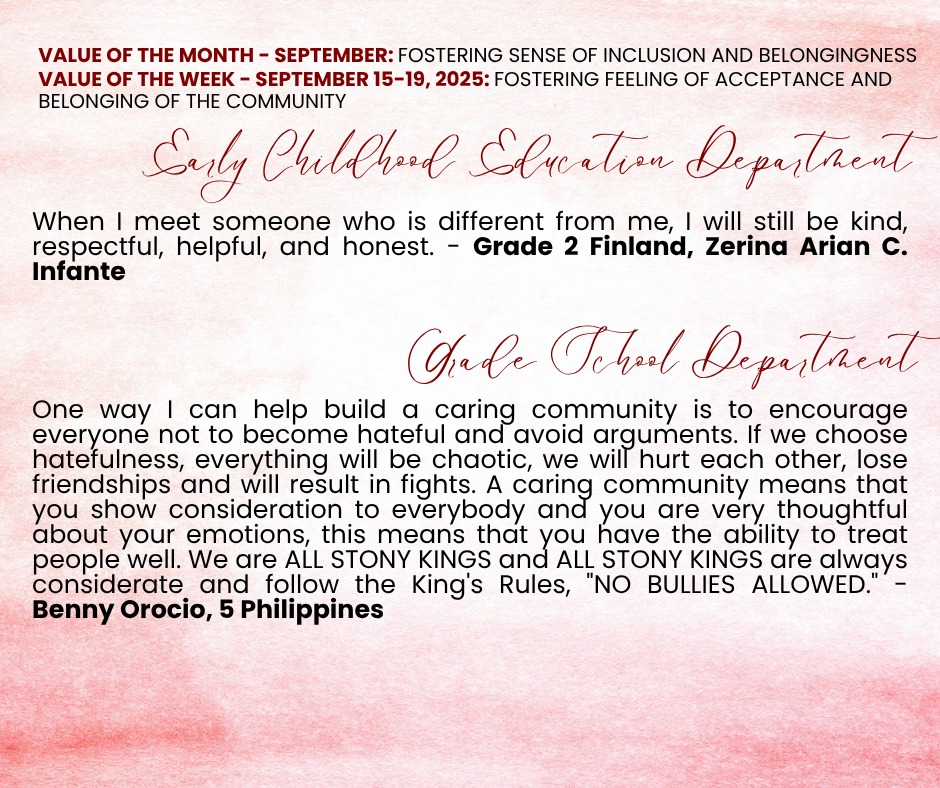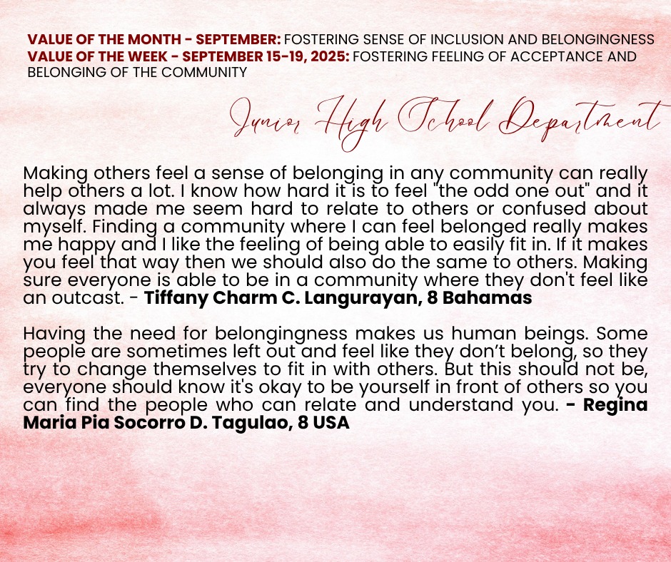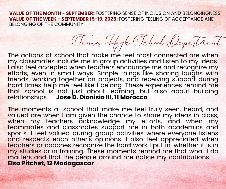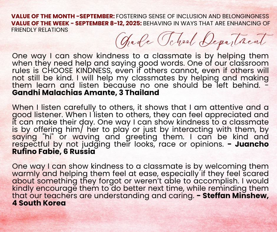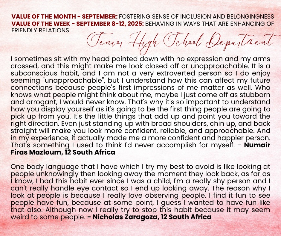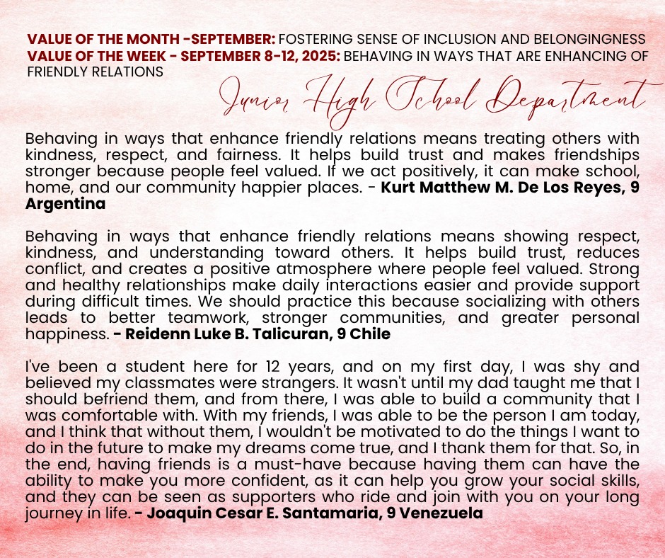 We are delighted to share the Best Value Reflections from our exceptional students for the week of September 8 to 12 and September 15 to 19. During this time, students focused on the value of “𝗕𝗲𝗵𝗮𝘃𝗶𝗻𝗴 𝗶𝗻 𝗪𝗮𝘆𝘀 𝘁𝗵𝗮𝘁 𝗮𝗿𝗲 𝗘𝗻𝗵𝗮𝗻𝗰𝗶𝗻𝗴 𝗼𝗳 𝗙𝗿𝗶𝗲𝗻𝗱𝗹𝘆 𝗥𝗲𝗹𝗮𝘁𝗶𝗼𝗻𝘀” and “𝗙𝗼𝘀𝘁𝗲𝗿𝗶𝗻𝗴 𝗙𝗲𝗲𝗹𝗶𝗻𝗴 𝗼𝗳 𝗔𝗰𝗰𝗲𝗽𝘁𝗮𝗻𝗰𝗲 𝗮𝗻𝗱 𝗕𝗲𝗹𝗼𝗻𝗴𝗶𝗻𝗴 𝗼𝗳 𝘁𝗵𝗲 𝗖𝗼𝗺𝗺𝘂𝗻𝗶𝘁𝘆”.