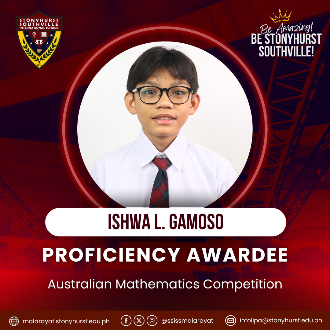 Stonyhurst Southville International School – Malarayat proudly celebrates Ishwa L. Gamoso for achieving an outstanding victory in the Australian Mathematics Competition (AMC)!