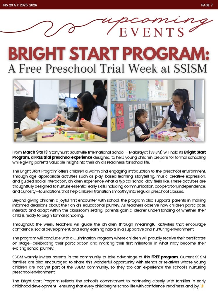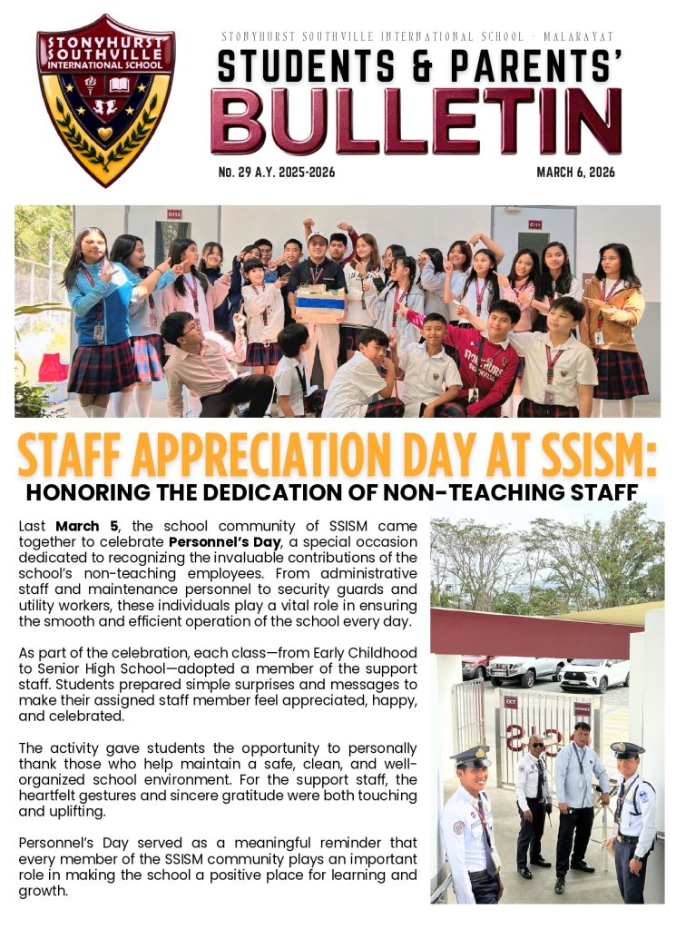 We are delighted to share with you the latest edition of the Students and Parents’ Bulletin (SPB) for Stonyhurst Southville International School – Malarayat (SSISM), SPB No. 29.