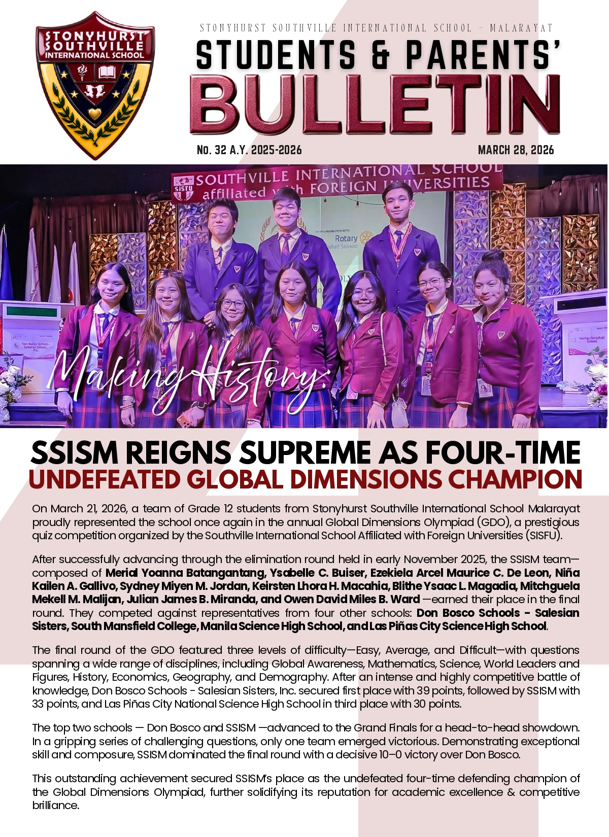 We are delighted to share with you the latest edition of the Students and Parents’ Bulletin (SPB) for Stonyhurst Southville International School – Malarayat (SSISM), SPB No. 32.