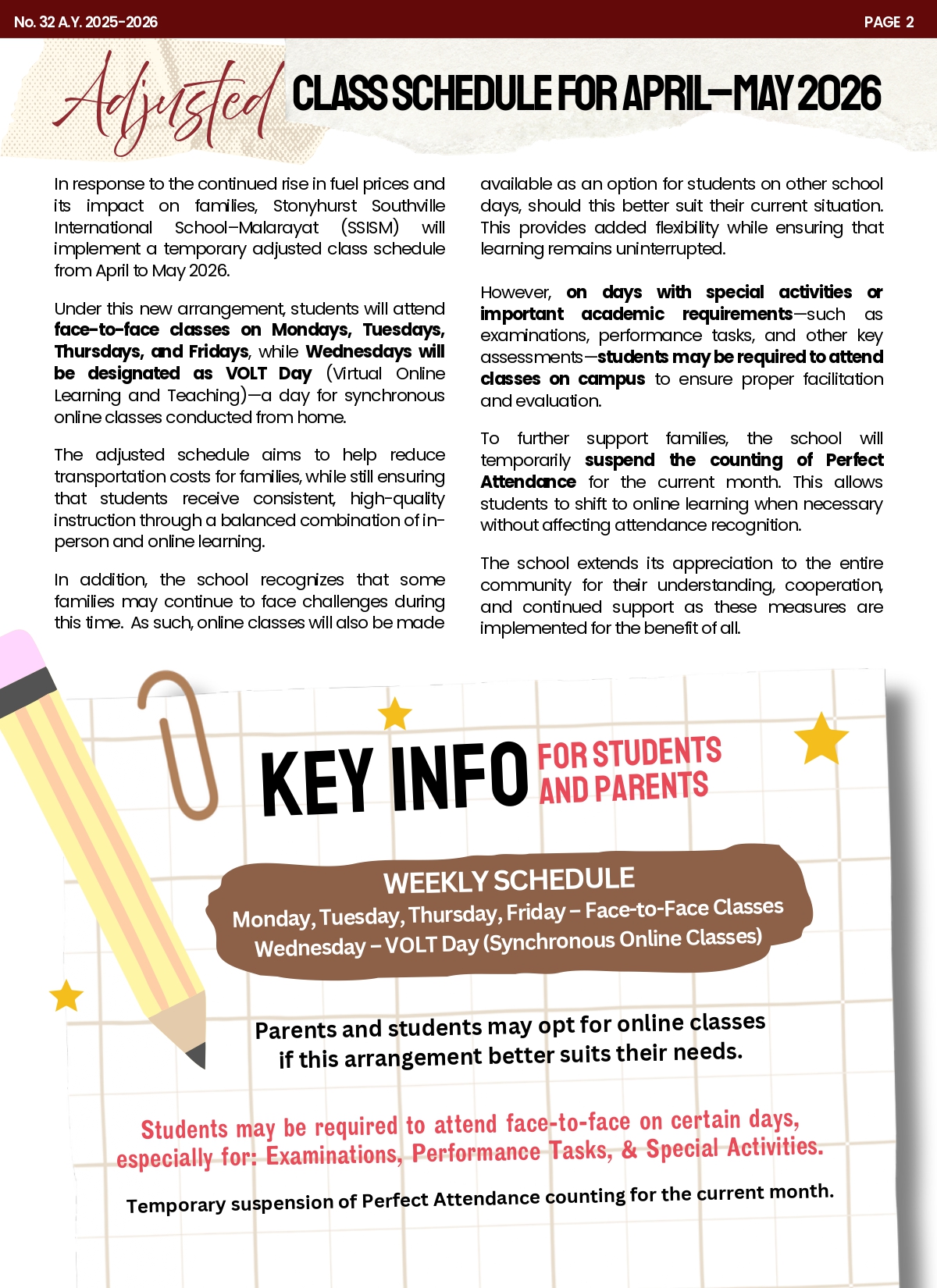 2. SCHOOL NEWS | ADJUSTED CLASS SCHEDULE FOR APRIL–MAY 2026