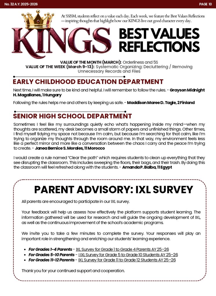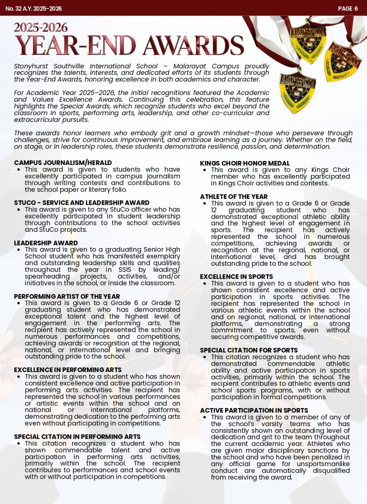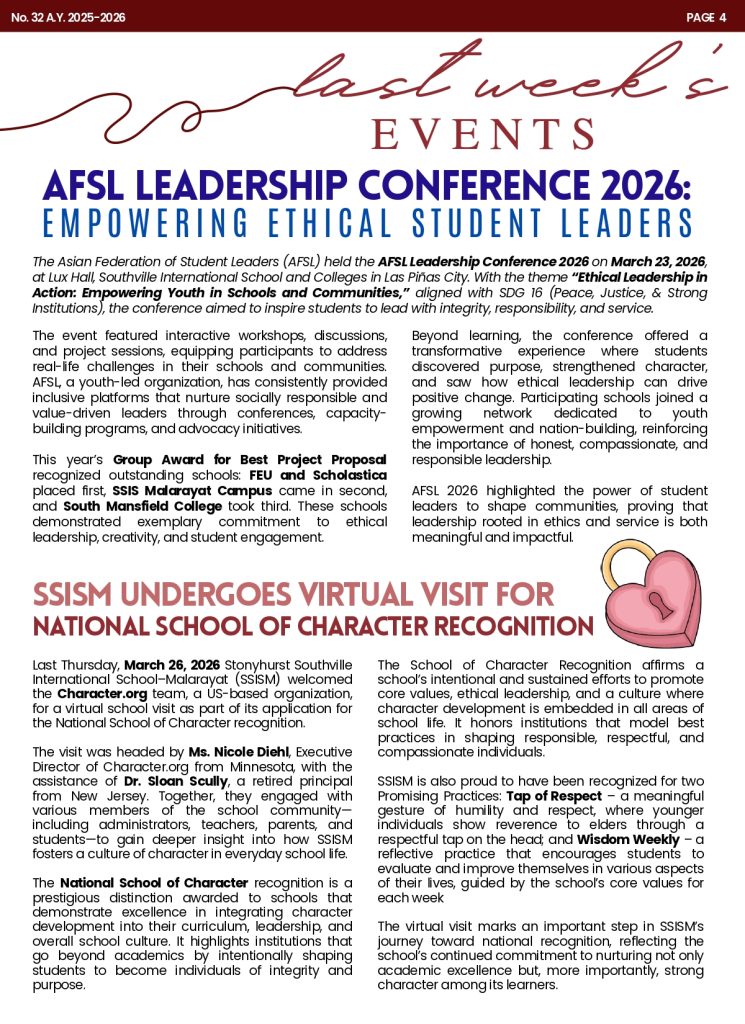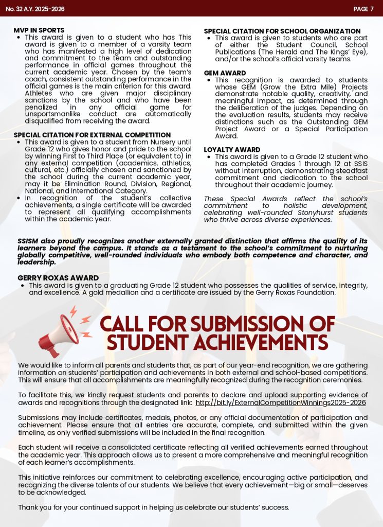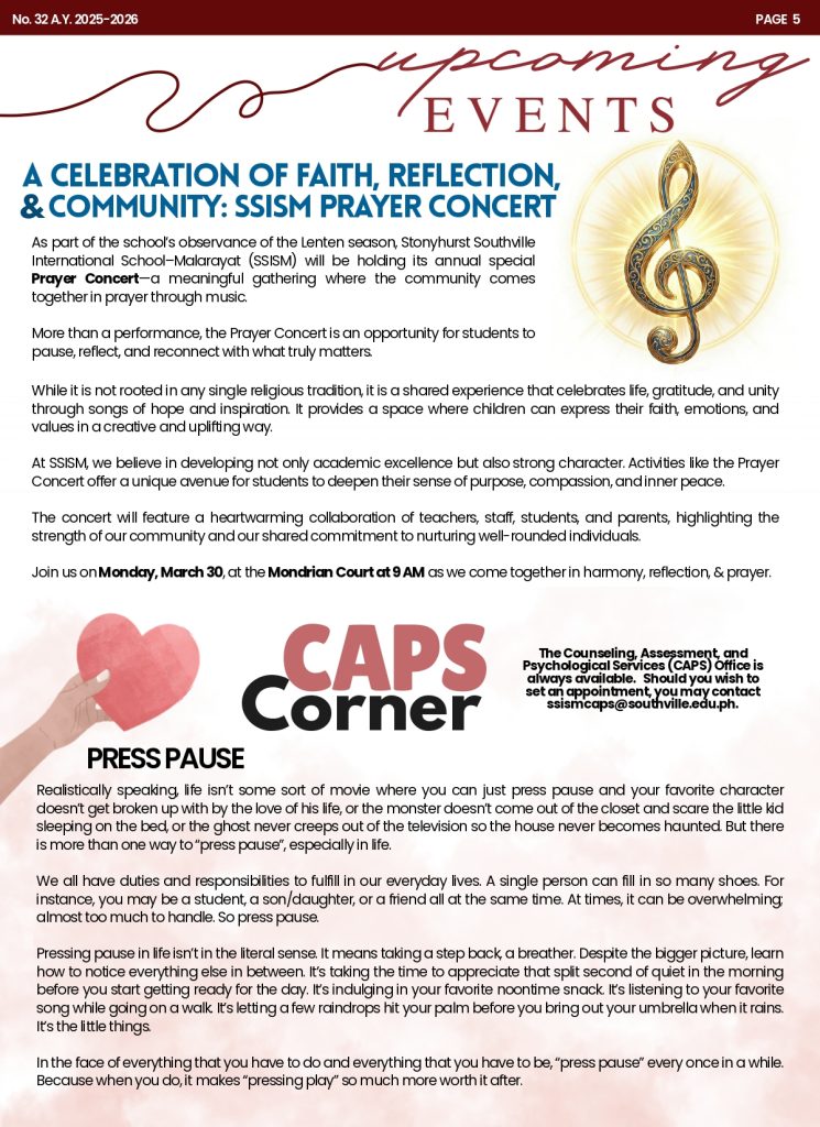 We are delighted to share with you the latest edition of the Students and Parents’ Bulletin (SPB) for Stonyhurst Southville International School – Malarayat (SSISM), SPB No. 32.