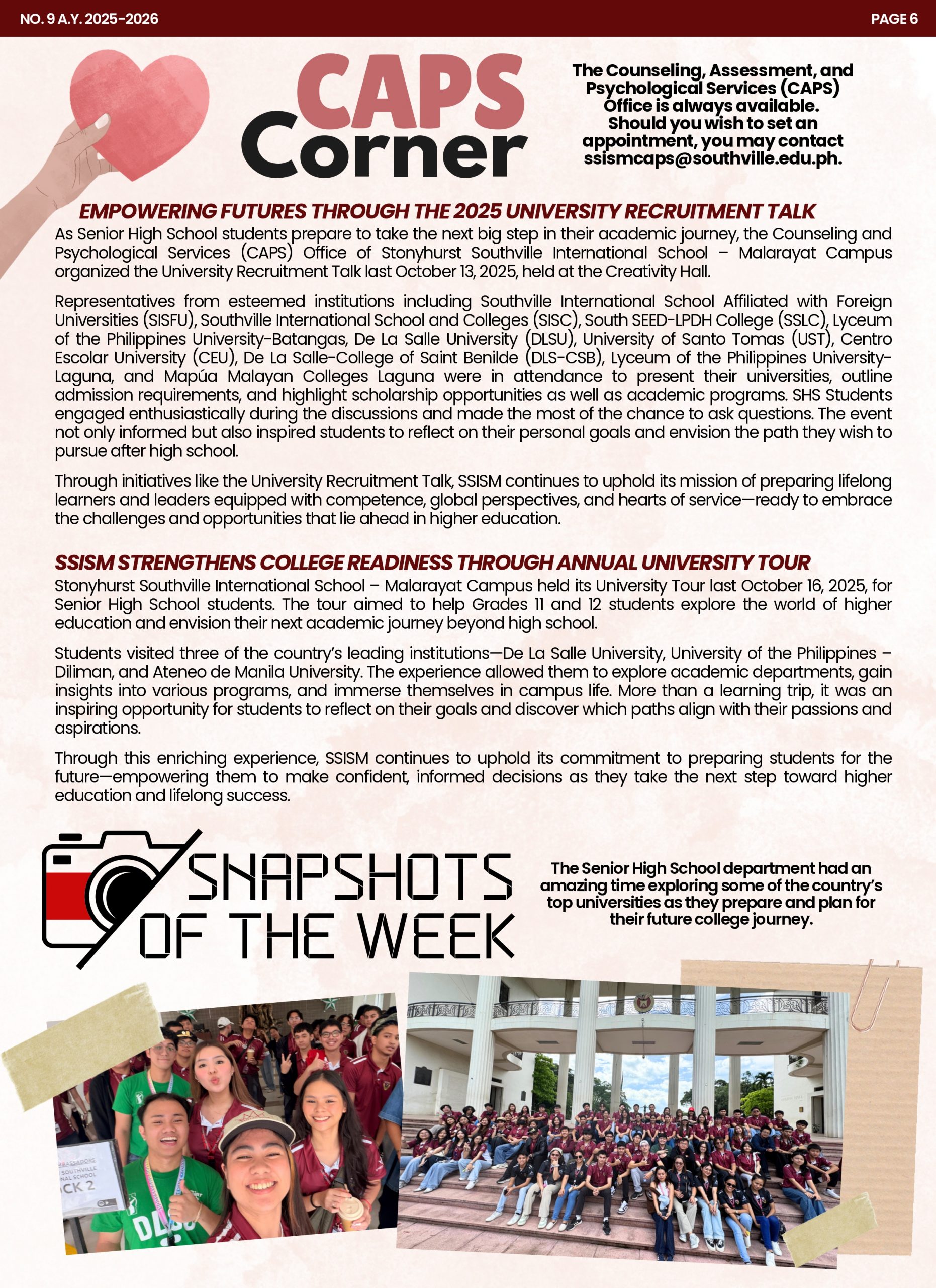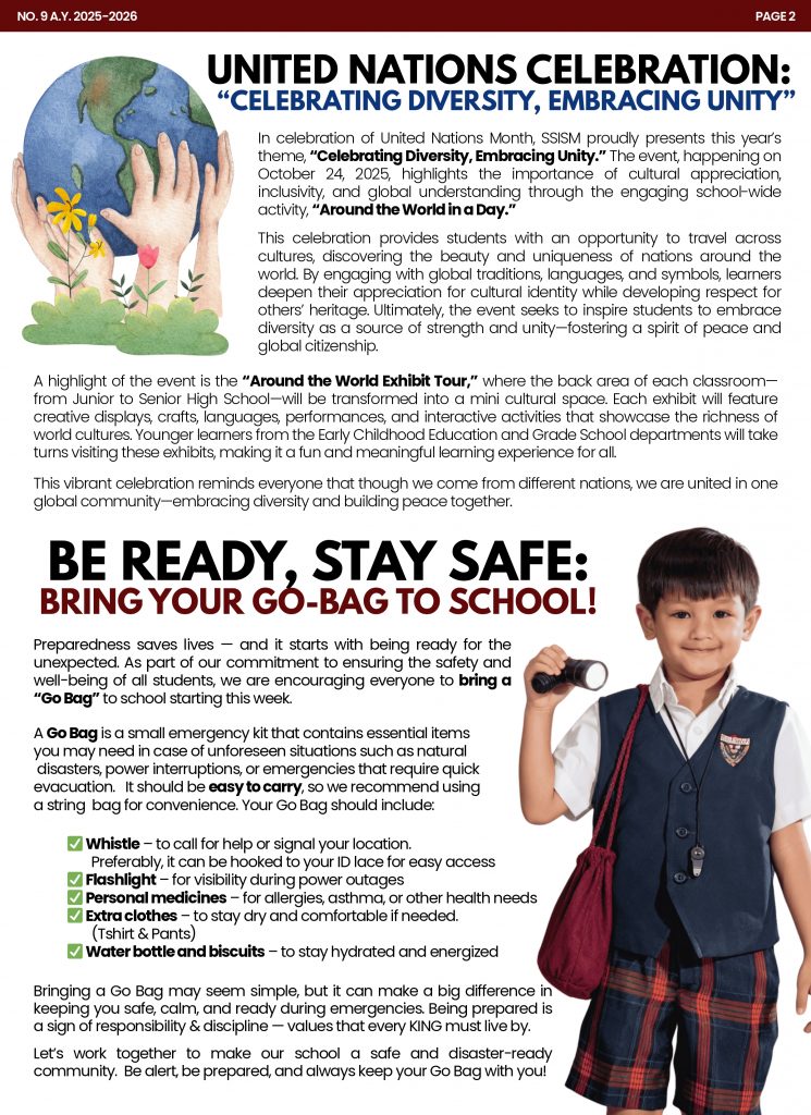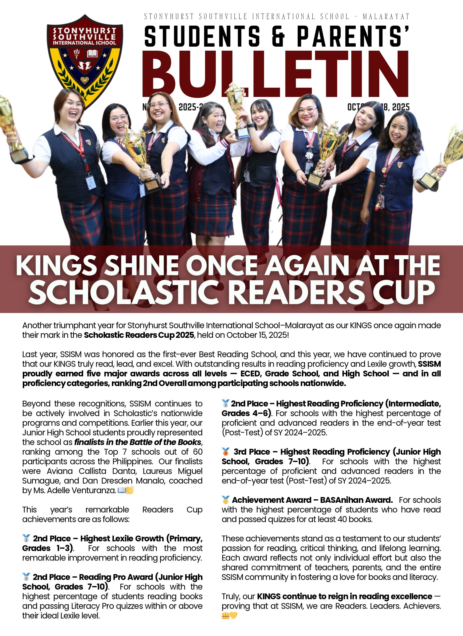 We are delighted to share with you the latest edition of the Students and Parents’ Bulletin (SPB) for Stonyhurst Southville International School – Malarayat (SSISM), SPB No. 9. In this newsletter, you will find updates and highlights of recent events and developments: