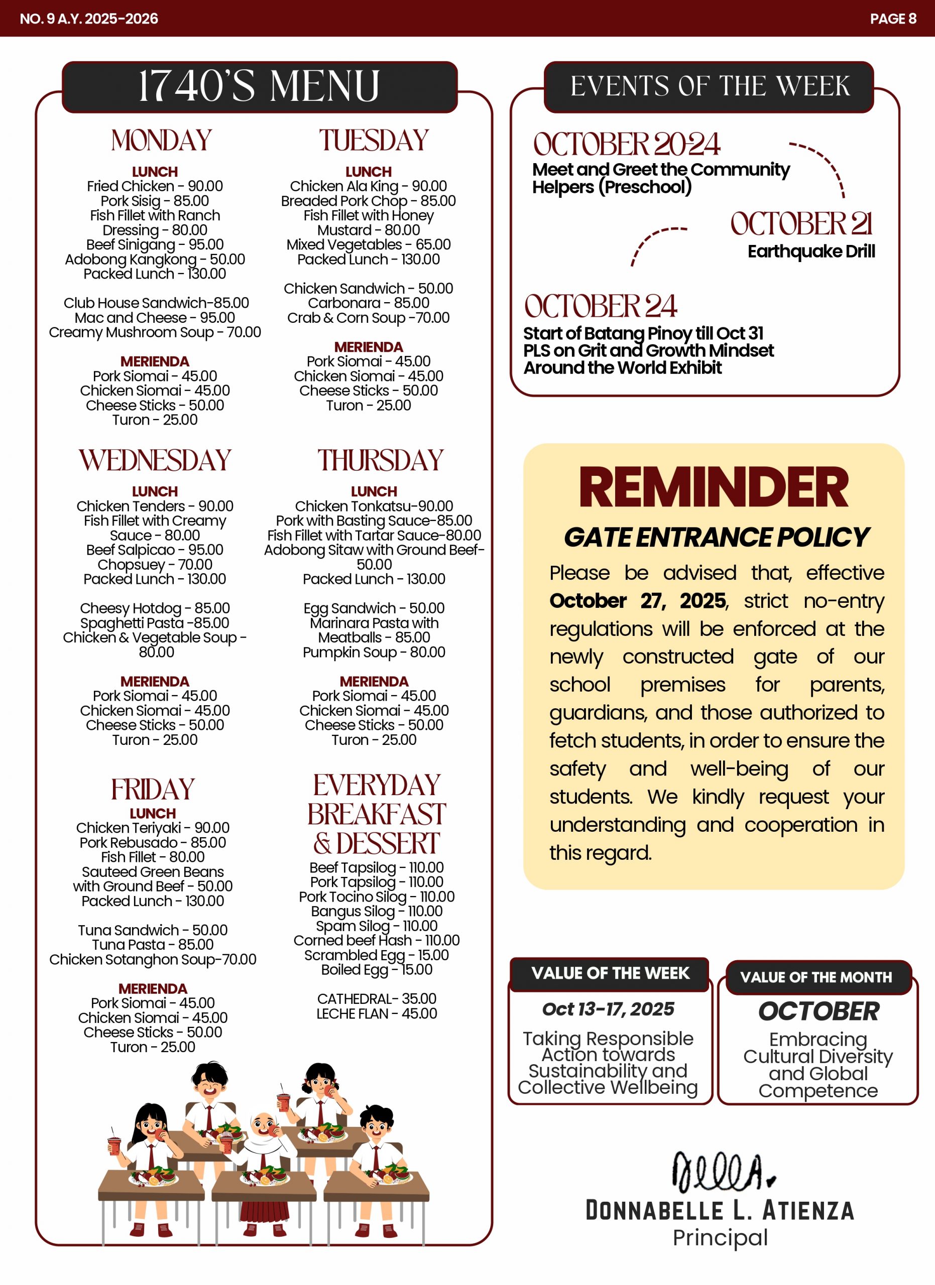 - Cafeteria Menu, Important Dates, Value of the Week and Month