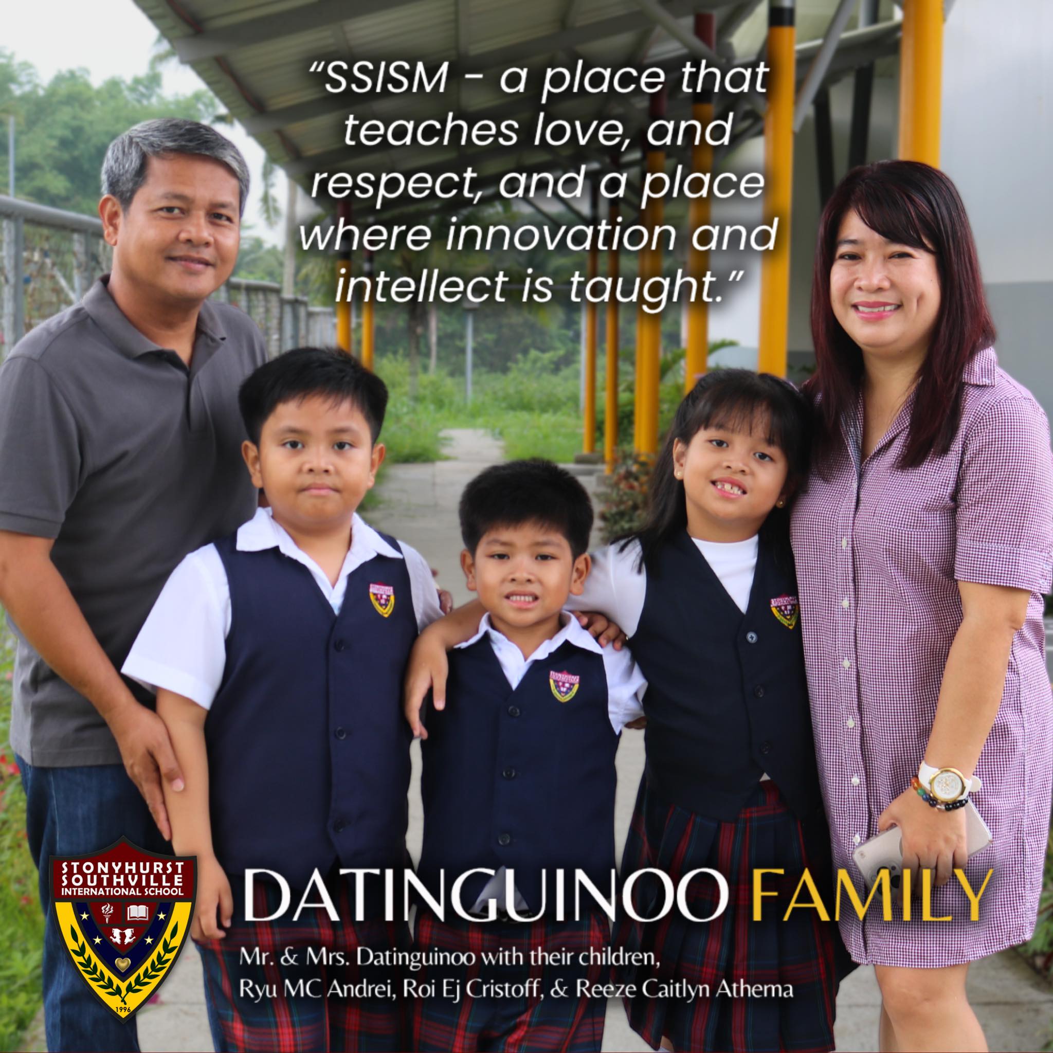 “We truly are grateful for SSISM for its continued service towards its students, and their families. Raising a family for the first time, we wanted to make sure we were giving our kids all of right things they’d need in life, and the proper education is crucial to anyone’s future. At Stonyhurst Southville International School – Malarayat, we found exactly that. A healthy, positive environment where our kids would be guided properly, a place that recognizes the value in working together while retaining individuality and honing your own personal talents. A place that teaches love, and respect, and a place where innovation and intellect is taught. With the school’s wisdom and undying passion for inspiring people, we are confident and sound at the fact that our kids are a part of the SSISM family. Moreover, we believe in Stonyhurst Southville International School – Malarayat and their mission, their goals. Over the years they have continued to progress in an optimistic fashion that is evident in the performance and values of their students. That is their legacy, and we as parents, are proud that our family is a part of that legacy.” — Datinguinoo Family