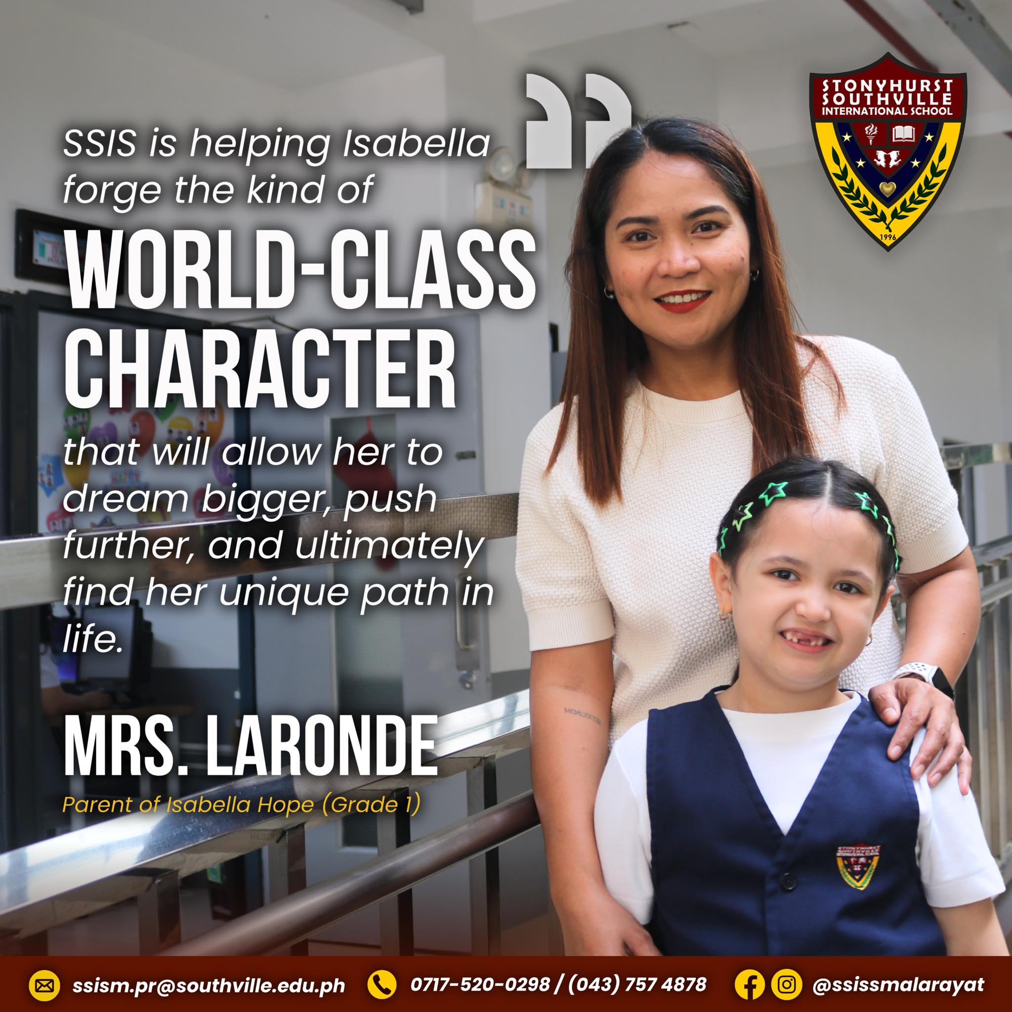 “When we were looking for the right educational start for our daughter, Isabella Hope, who is now in Grade 1, we searched for a school that would do more than just teach lessons. We looked for a place where she could truly begin to find herself. For us, Stonyhurst Southville International School (SSIS) stood out as the best educational proposition we saw in the region. From the moment Isabella started, we felt a deep impact. The environment at SSIS is so warm and genuinely supportive. The Community—both students and teachers—are kind, making us feel immediately welcomed and accepted. We firmly believe that by instilling grit and a growth mindset, SSIS is helping Isabella forge the kind of world-class character that will allow her to dream bigger, push further, and ultimately find her unique path in life. We are incredibly glad to be a part of the SSIS family.” — Laronde Family